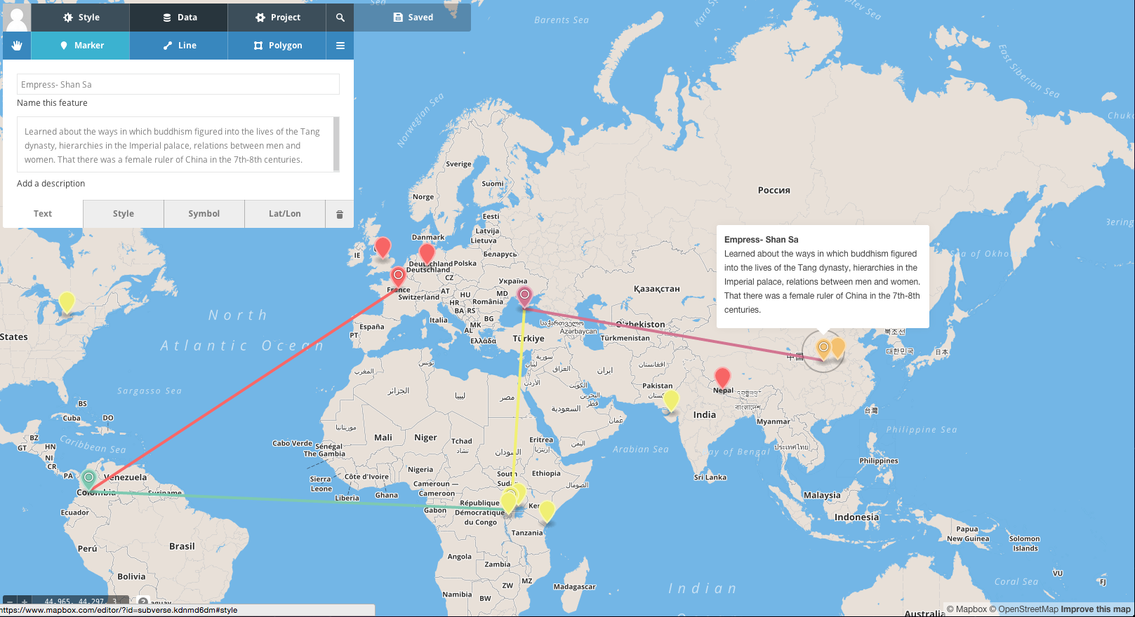 Mapping this entry posed a couple of challenges. Mapbox uses OpenStreetMaps for its map data. The names of places are written in the language of each specific country. When it came to determining a location for this book, I had to figure out where “Long Peace,” the location of the Imperial city was. I confess that I had to turn to Wikipedia and Google Maps for help.